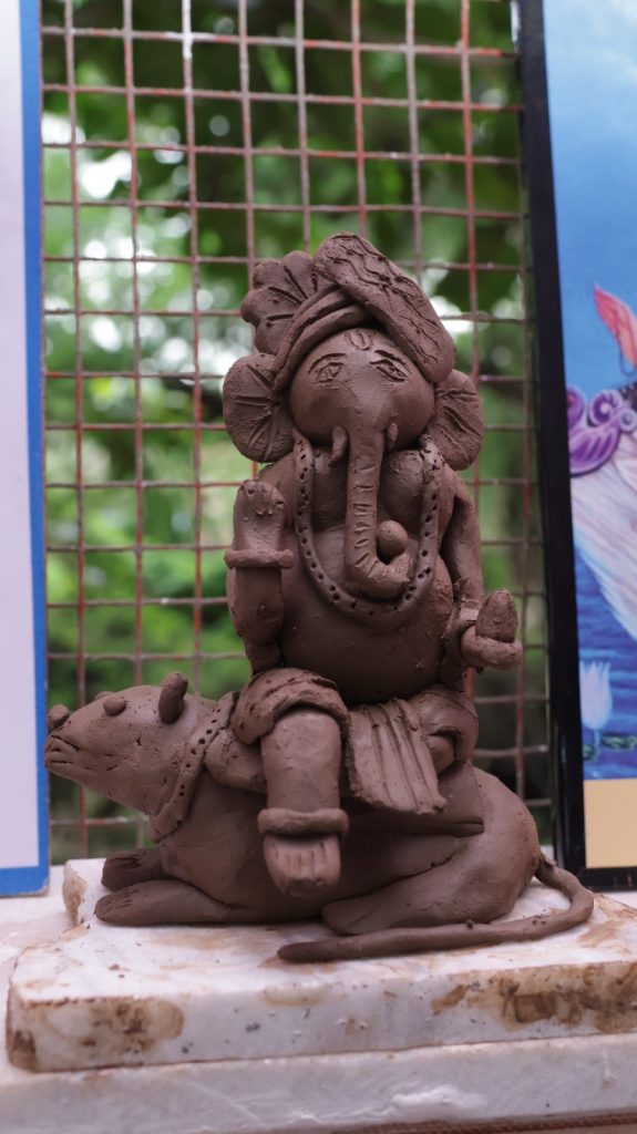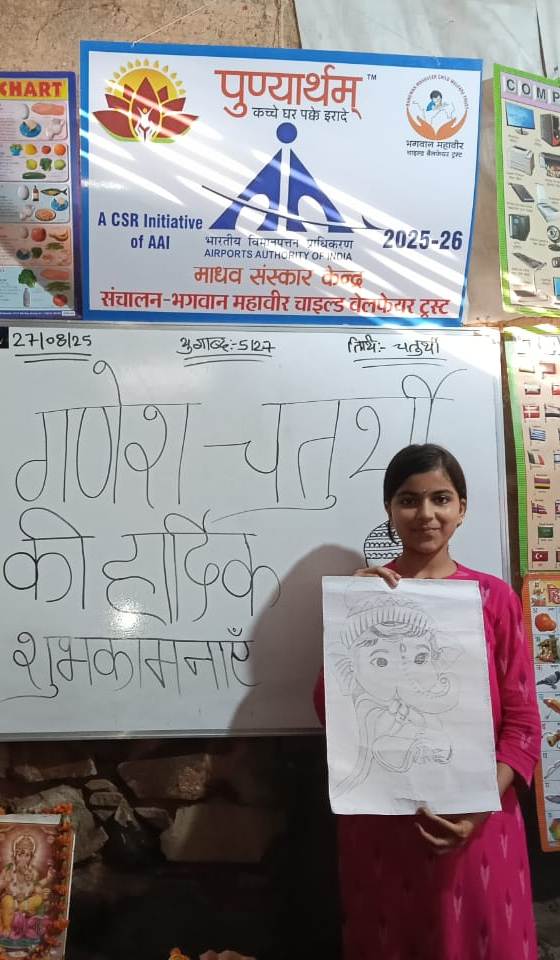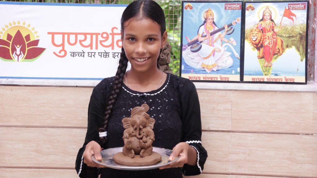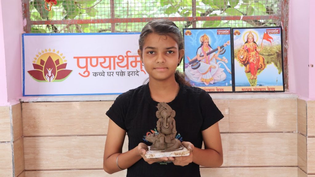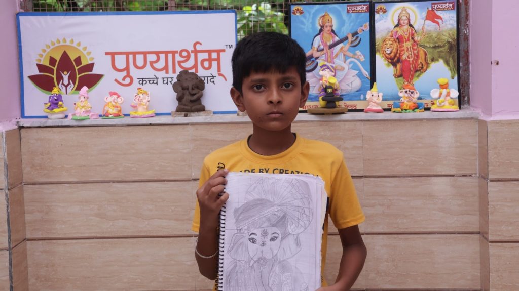 पुण्यार्थम् संस्था द्वारा कच्ची बस्ती में रहने वाले (माधव संस्कार केंद्र) के बच्चों ने 26अगस्त 2025 गणेश चतुर्थी को खास बना दिया है। इन बच्चों ने मिलकर इको-फ्रेंडली गणेश प्रतिमाएं तैयार की हैं, जो पूरी तरह से मिट्टी, आटे और प्राकृतिक रंगों से बनी हैं। कुछ बच्चों ने तो पुराने अखबार और रद्दी सामग्री का भी उपयोग कर सुंदर प्रतिमाएं बनाई हैं।